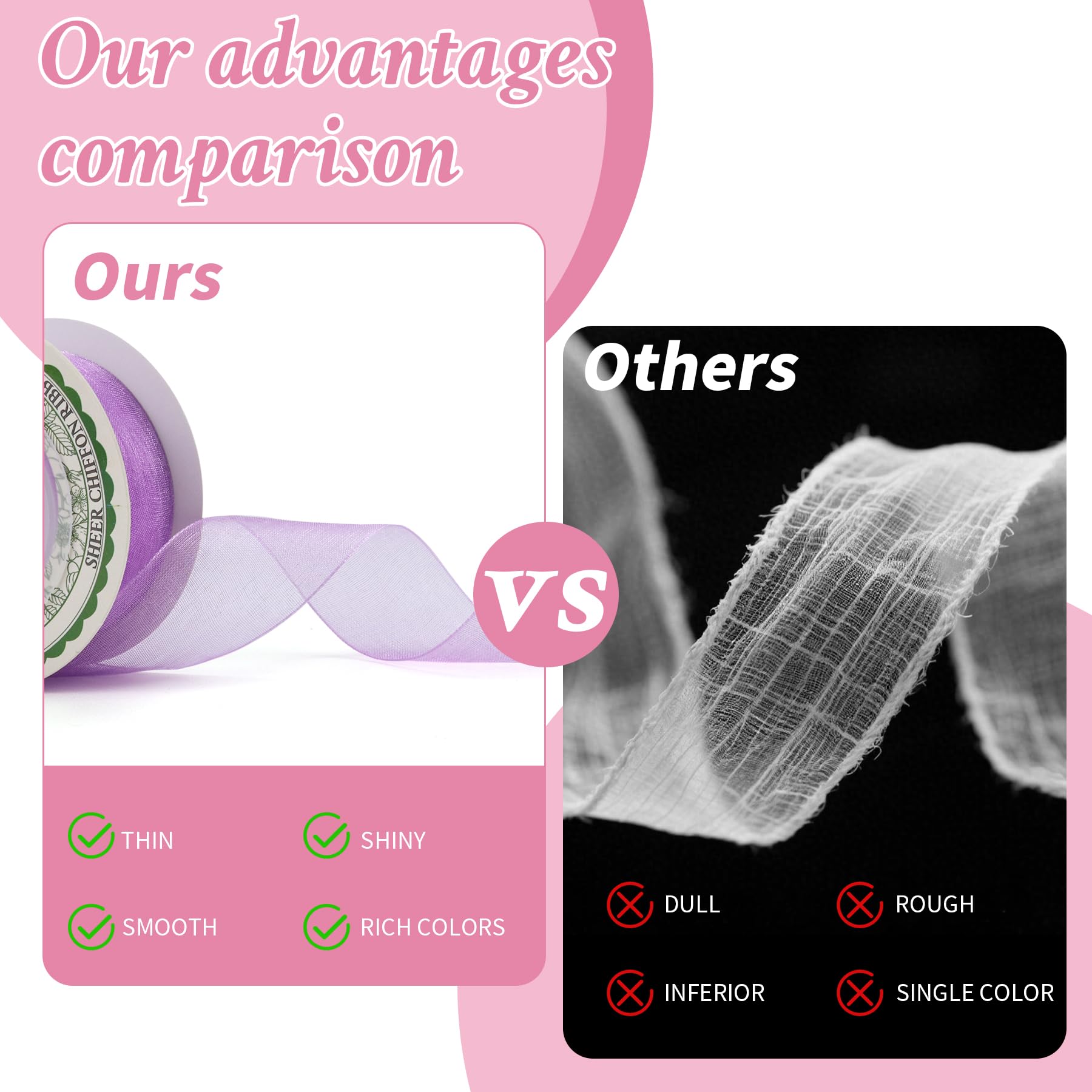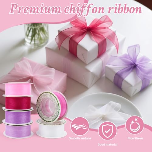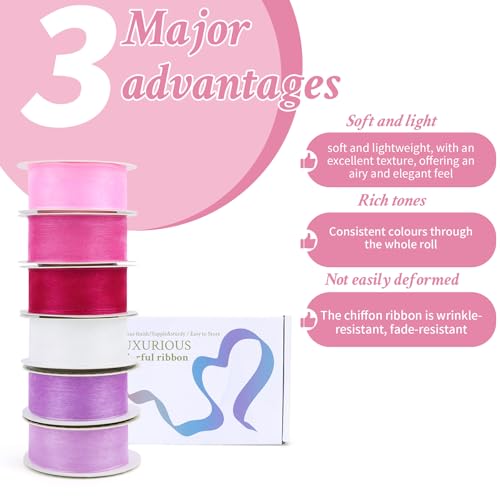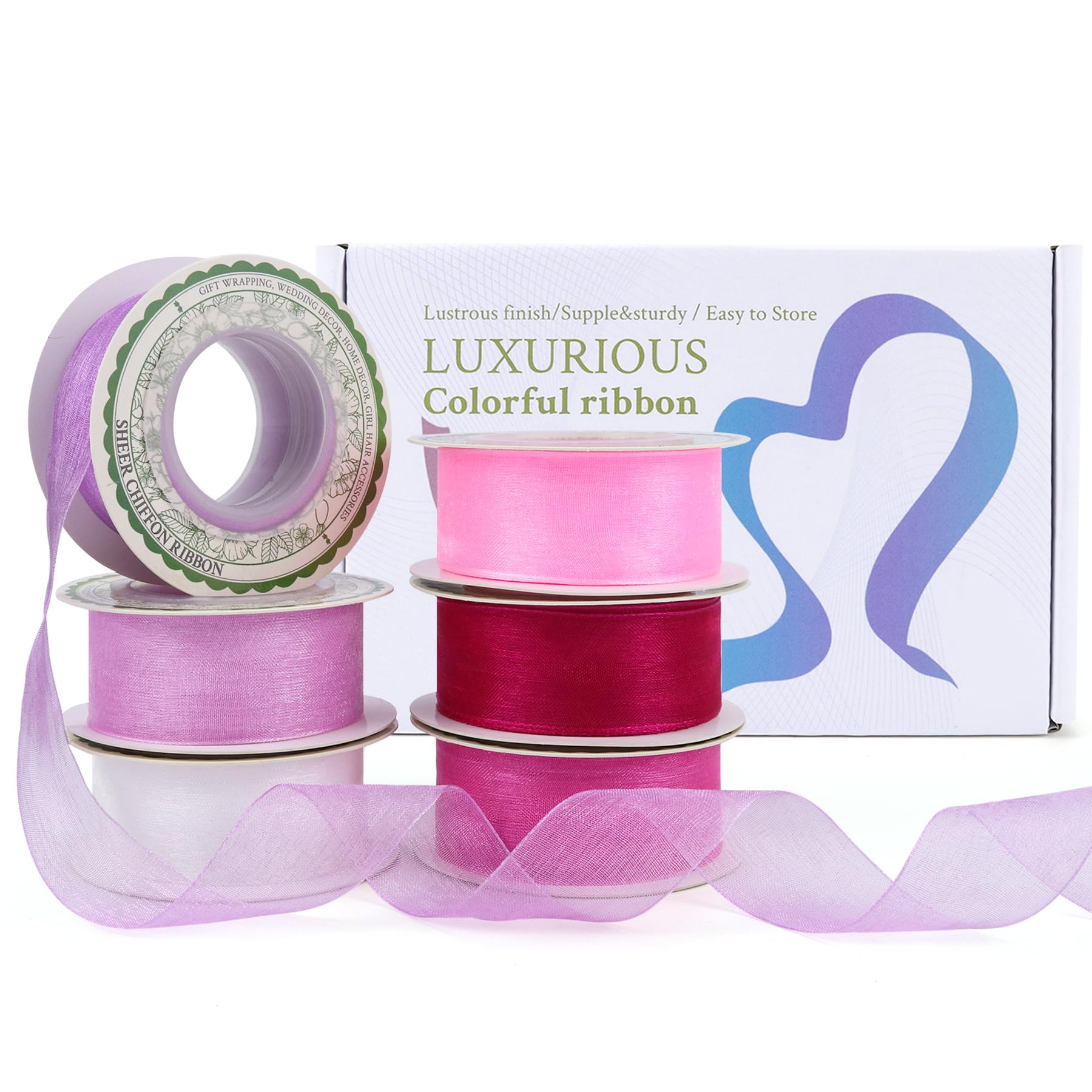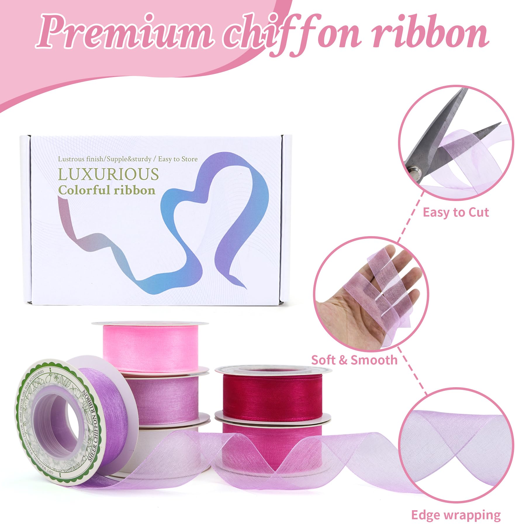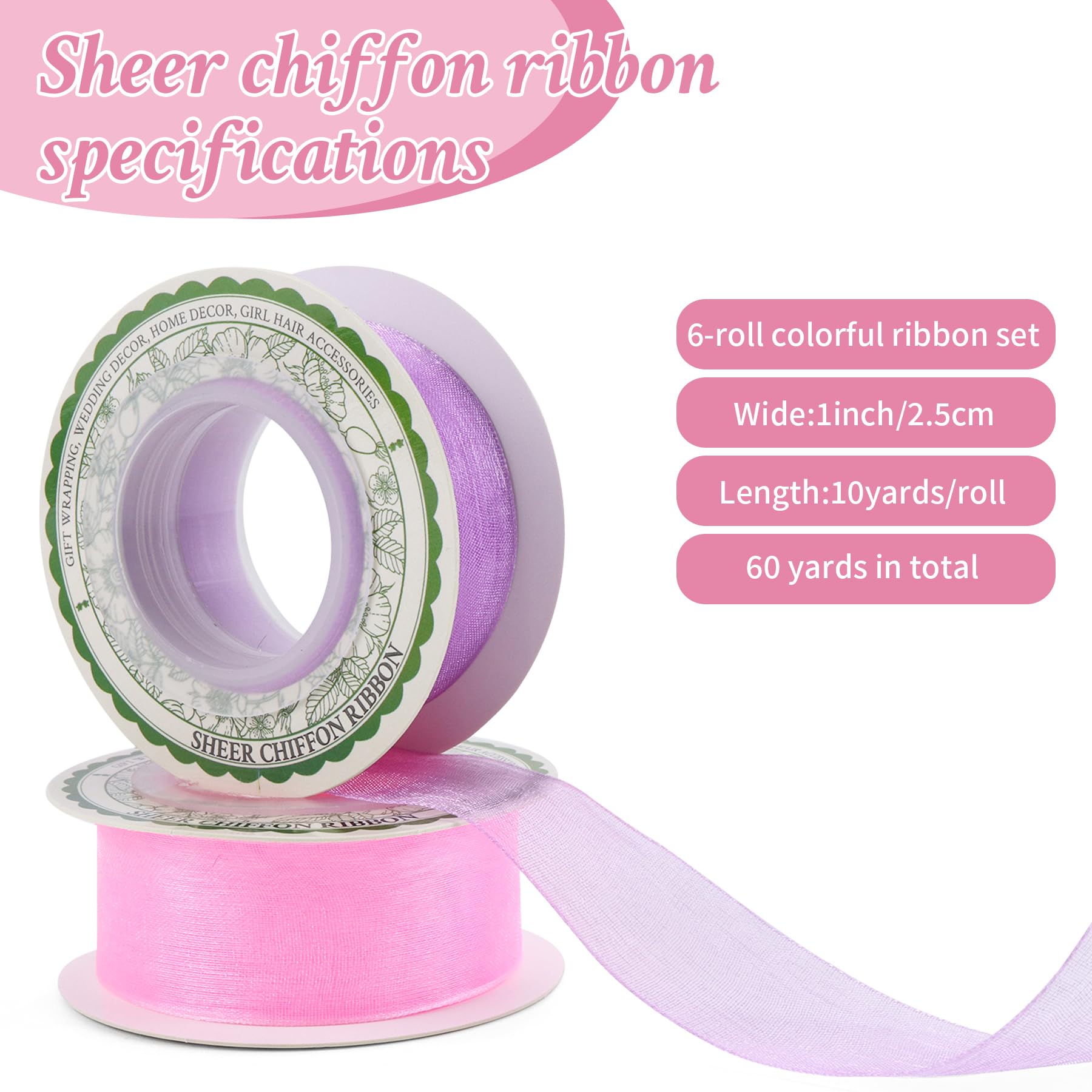 - Enough Quantity: package comes with 6 rolls 1 inch wide sheer chiffon ribbons,Total 60 yards allowing you to finish your decoration or wrapping need, or you can also share with others, ideal for decorating different occasions, wrapping wreaths, garlands, flowers, packaging gift box and so on