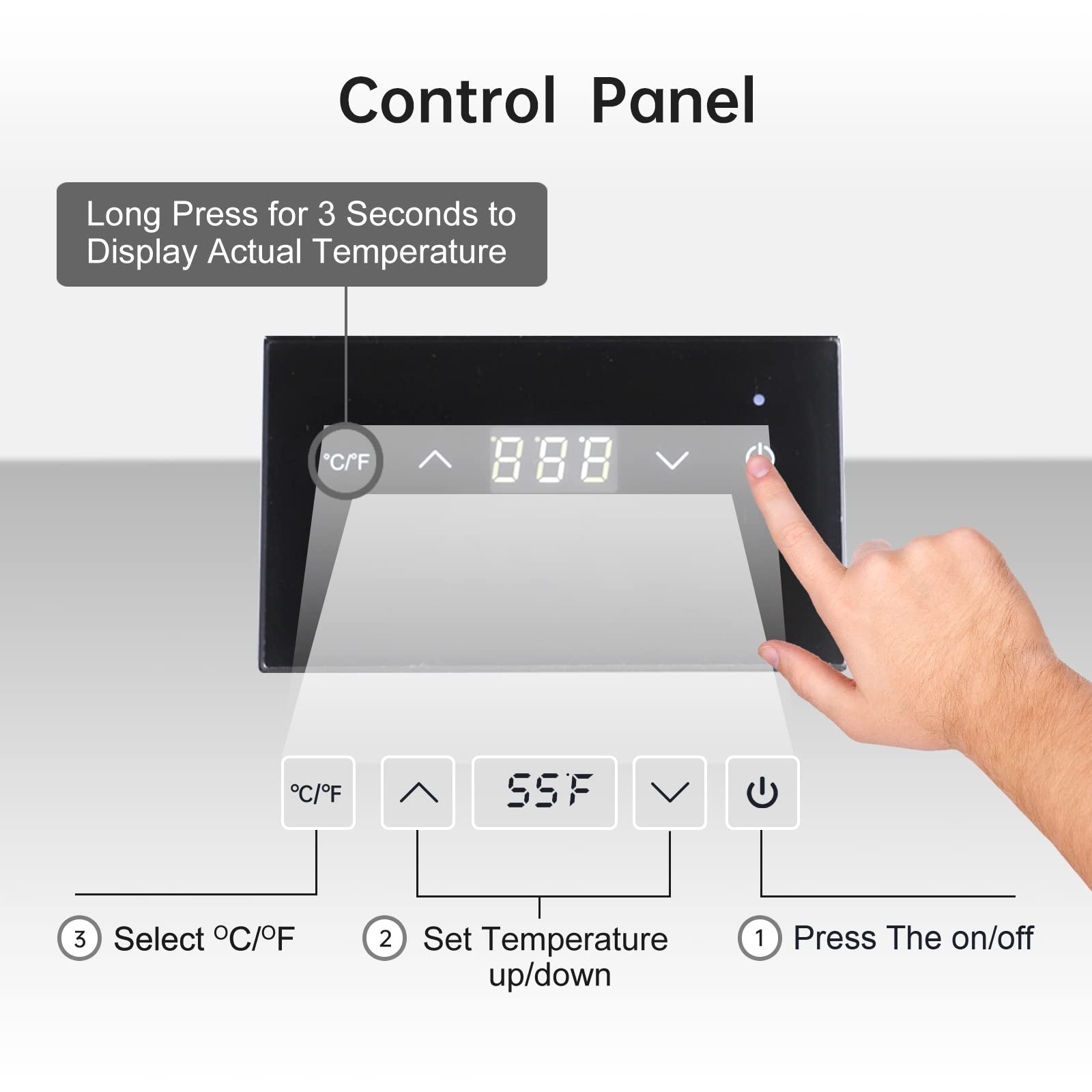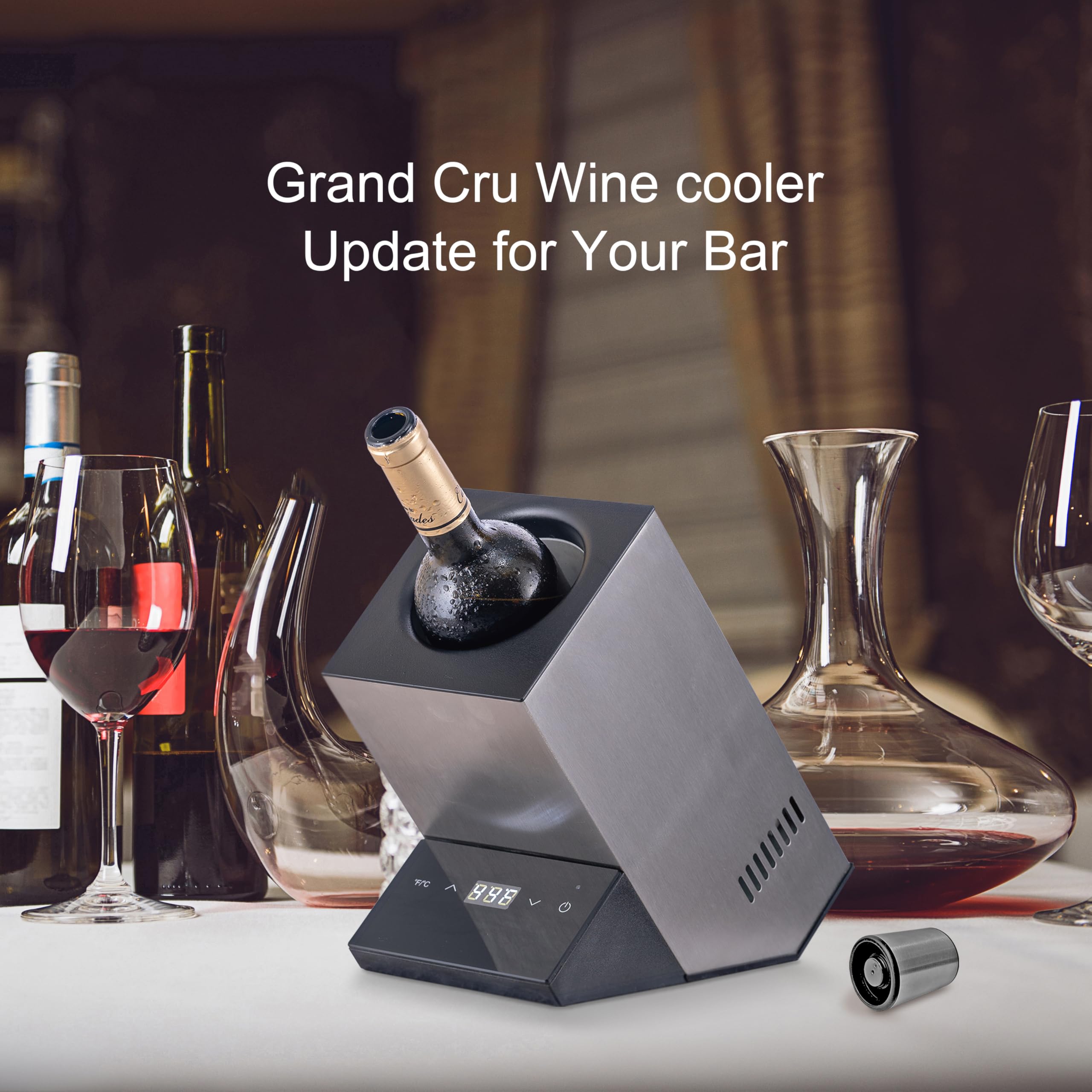 - Easy to Use: Step1: Turn on the wine bottle chiller. Step 2: Set the temperature. Step 3: Place a suitable bottle (less than 3.74” in diameter) in the wine chiller. Step 4: The device begins to cool down. The LED will flash until the set temperature is reached. After that, it will be continuously illuminated.