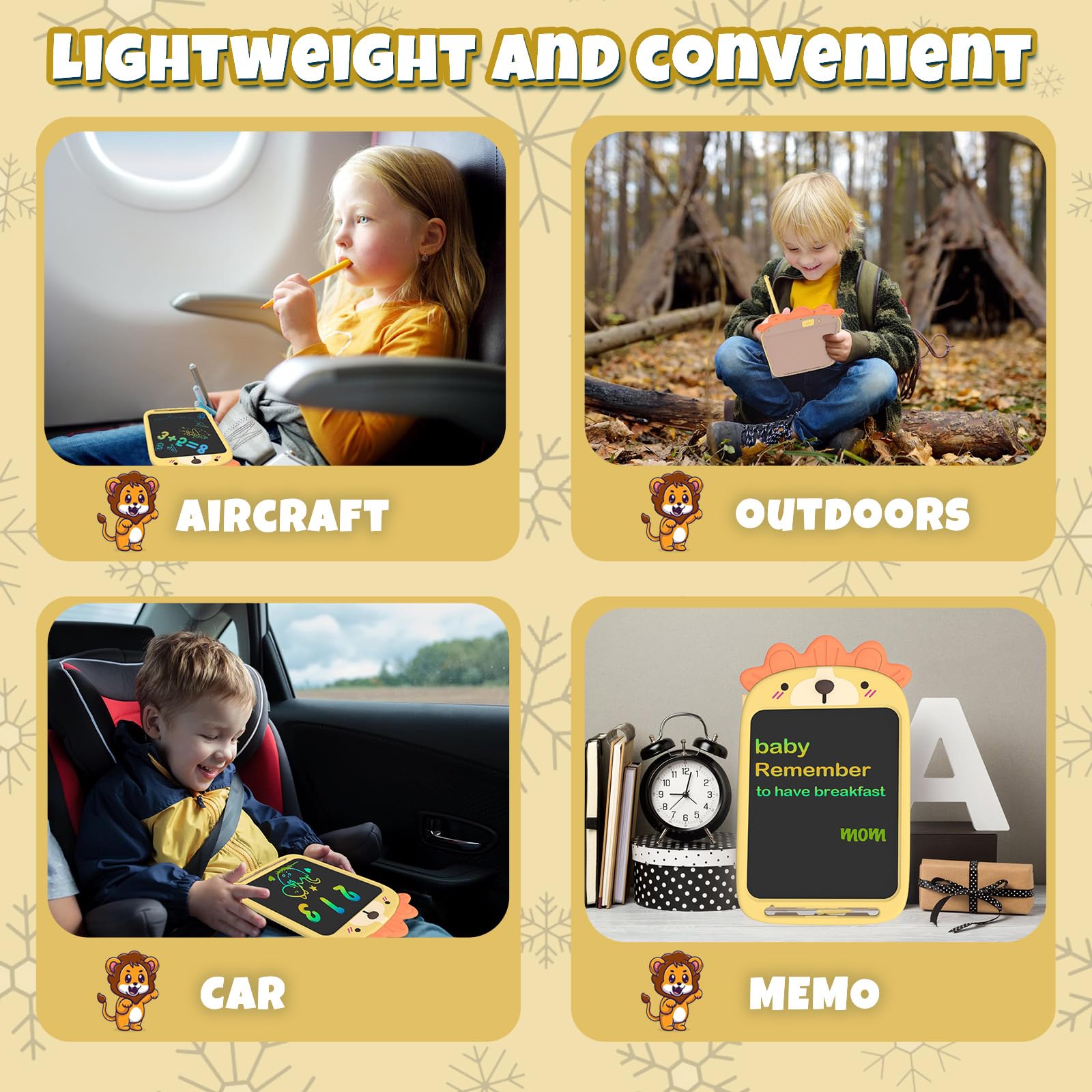 - ðãMultiple UsageãThe drawing board for kids can be used for drawing, doodling, writing, counting and so on! Perfect for leaving messages for family, shopping lists, to-do lists, recipes, and even office Memos. which is suitable for multiple occasions: airplane, car, restaurant, sofa, etc.