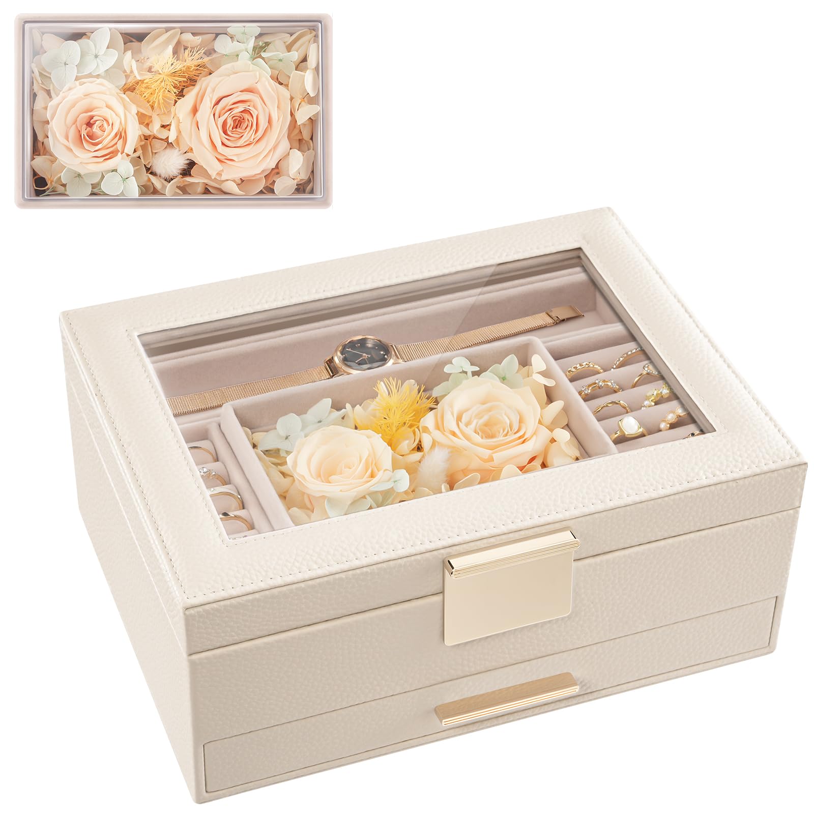 - 2 layers with drawer: organizing jewelries of various sizes and shapes, including earrings, bracelets, rings, necklaces, watches. Size: 10.24″ x 7.68″ x 4.53″