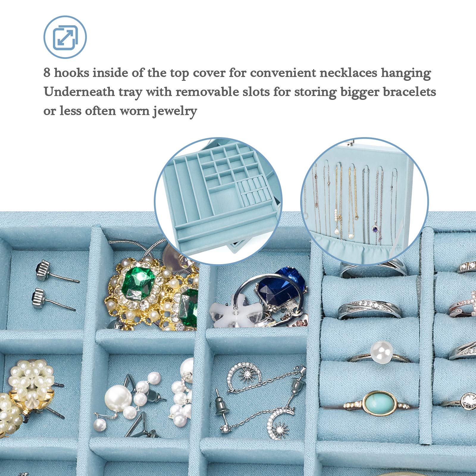 • ❤️ 8 hooks inside of the top cover for convenient necklaces hanging; Elastic bottom pouch keeps necklaces stay in place and preventing them from dangling and tangling; Underneath tray with removable slots for storing bigger bracelets or less often worn jewelry